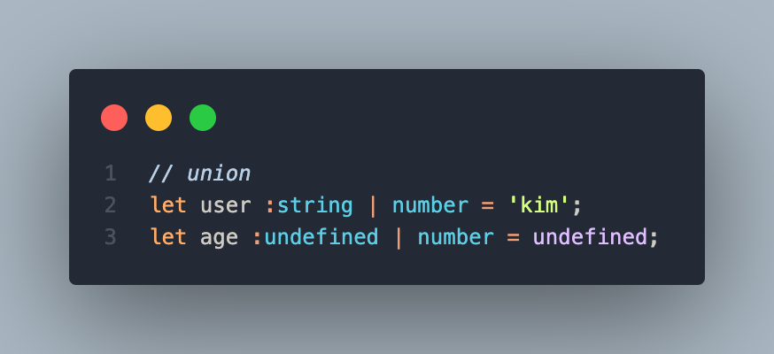 이미지처럼 user의 이름이 당연히 string 타입이겠지만, 숫자로 불릴 수도 있기 때문에 number 타입도 같이 지정이 가능합니다.