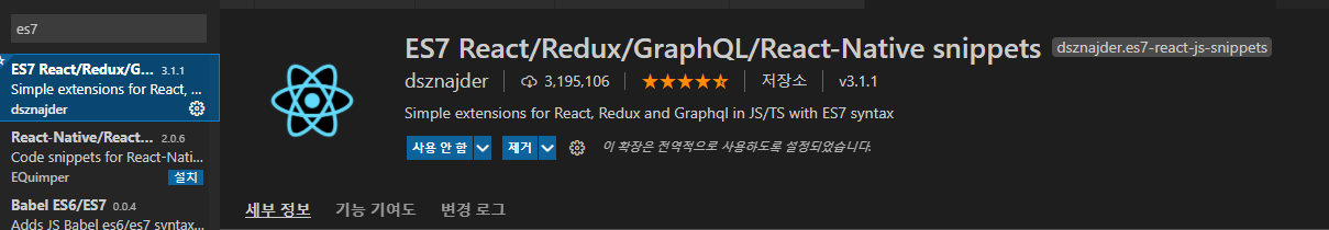 vscode에서 'es7'을 검색하신 뒤에 다음 확장프로그램을 설치해 주시면 rfce만 쳐도