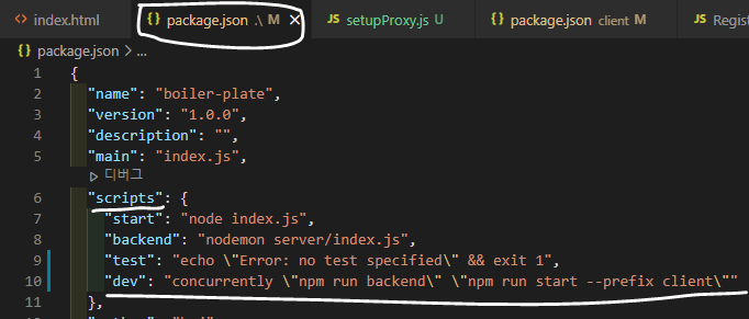 이치럼 package.json 파일에 script 안에 dev를 만들어 하나로 합쳐주고, npm run dev로 실행해 줍니다.