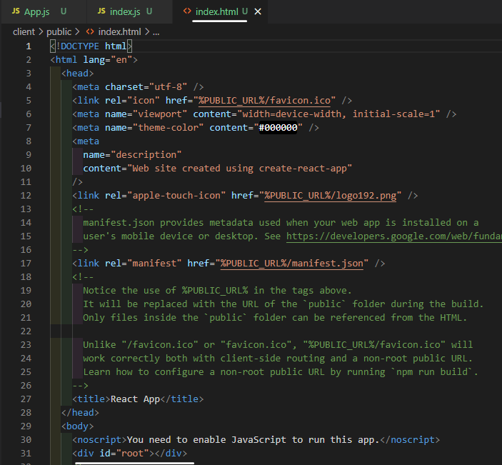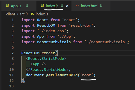root가 오는 자리를 보면, 보시다시피 index.html의 root와 index.js의 getElementById('root') 위치가 같아야 합니다.