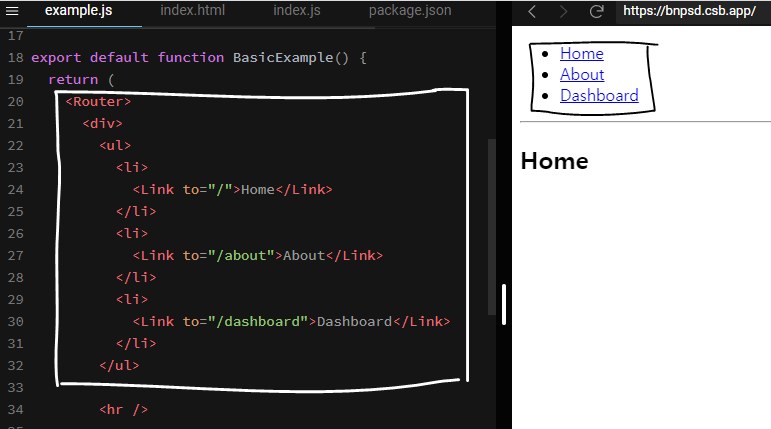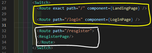 원래는 하얀색 박스처럼, Route로 묶어서 그 안에 이동 페이지를 작성해줄 수 있는데, 노란색 박스처럼 component를 이용해서 더 깔끔하게 작성이 가능합니다.(이때 '/'를 이용하여 닫아주기)