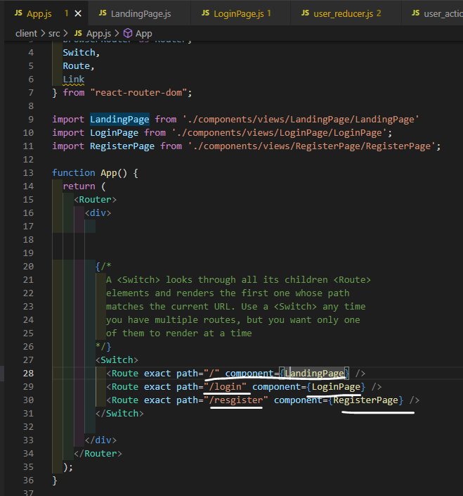 localhost:3000을 접속하면 가장 먼저 뜨는 시작 페이지(LandingPage)는 App.js에서도 보시는 바와 같이, path에 아무것도 값이 입력되어 있지 않기 때문에 localhost:3000으로 접속하면 가장 먼저 보이는 화면인 것을 알 수 있습니다. 밑에는 path='/login'을 입력해줬기 때문에, localhost:3000/login을 입력하면 LoginPage로 가도록 component를 지정해준 것을 확인하실 수 있습니다.