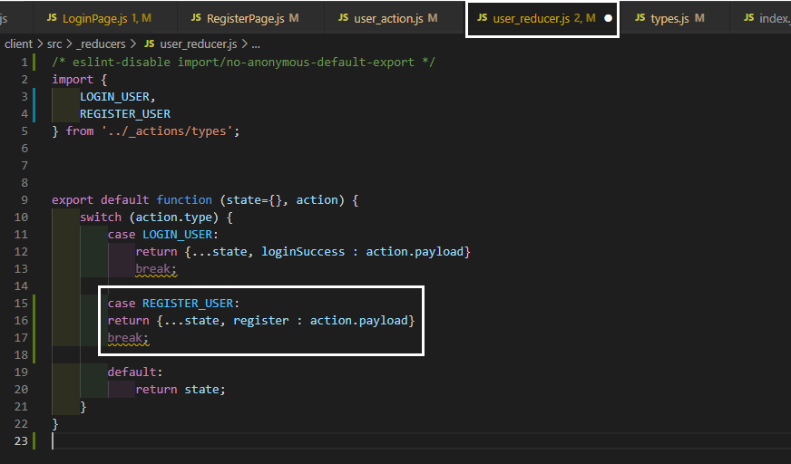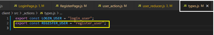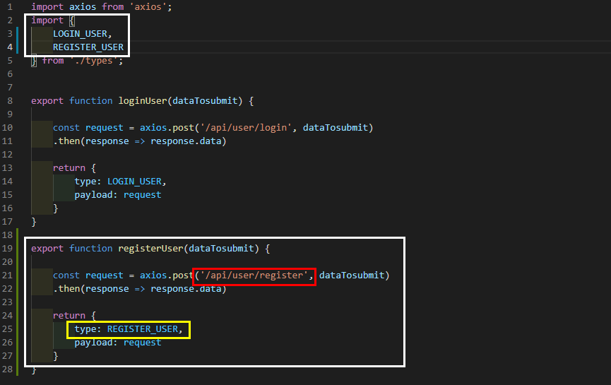 위에 export ~ 로 시작하는 소스코드를 복사해서 똑같이 작성해줍니다. 꼭 import에 LOGIN_USER 다음에 REGISTER_USER 추가해주시는 거 잊지 말아야 합니다. 여기서 빨간색 테두리는,