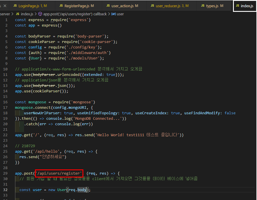node 서버의 index.js 파일에 가 보면, app.post('/api/users/register')와 같게 작성해줘야 하고요. 노란색 테두리의 경우는,
