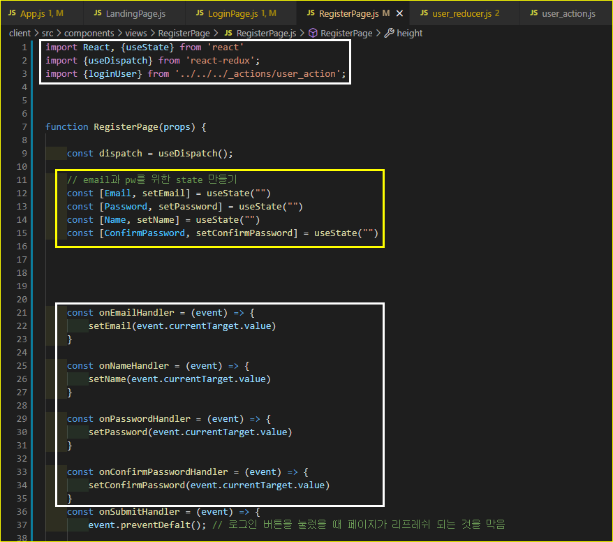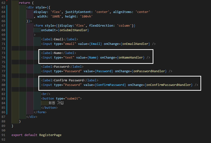 노란색 테두리는 작성한 state인데요. 회원가입 페이지에서 사용 할 이름과, 비밀번호 확인을 위한 state를 만들었습니다. 지난 포스팅(로그인 페이지 만들기)에서 작성하지 못한 부분이 하나 있는데, onChange에 현재 값이 발생하는 함수를 지정했습니다. 다시 말하면 onChange의 역할은 저희가 값을 입력할 수 있게 해줍니다.(실제로 없으면 값 입력이 안됨)