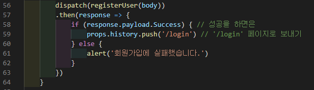 성공을 하면, 로그인 페이지로 보내고, 실패할 시 '회원가입에 실패했다'는 alert 창을 띄워야 하는데요. console에 에러는 안 뜨는데, 뭐 아무 반응이 없습니다..