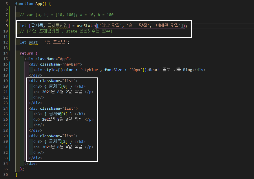 빨간색 테두리: p 태그에 변수 post를 { post }로 불러오기