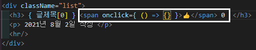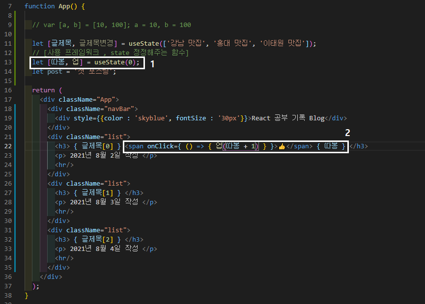 state를 하나 만들어 줍니다. useState(0)으로 함으로써, 초기값?을 0으로 설정을 해 주고요. 저기 1번 하얀색 테두리에서 '업' 자리가 state를 정정해주는 함수라고 했죠? 그렇기 때문에 바뀌는 값을 입력할 것이기 때문에, 2번 하얀색 테두리 안에 현재 사용되는 '따봉'에 1을 더해주는 함수인 '업'을 입력해줍니다.