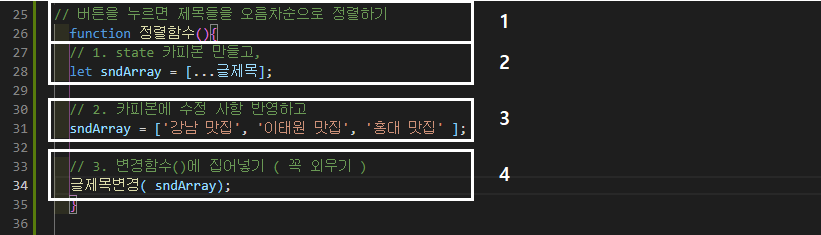 2. 우선 카피를 해야겠죠? 새로운 변수 sndArray에 [...글제목]으로 카피해 줍니다.