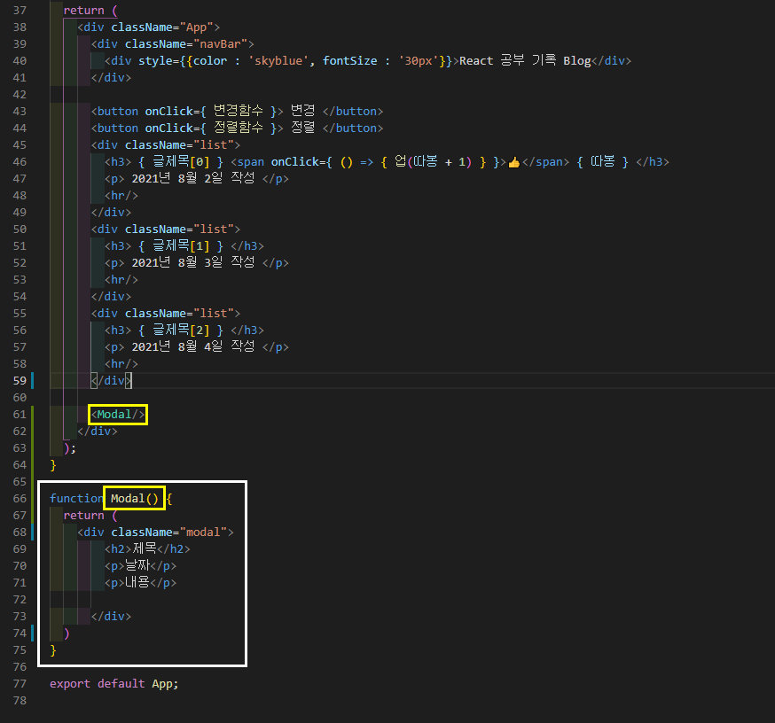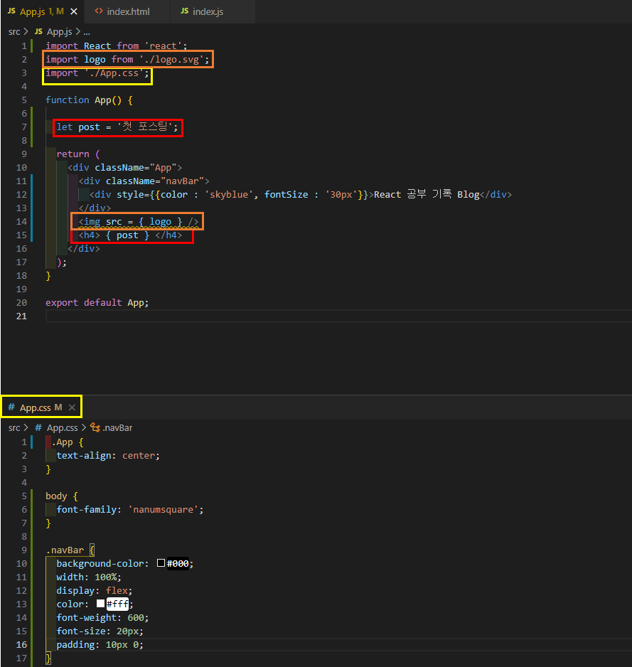 노란색 테두리: App.css에 작성한 내용을 import로 불러오기