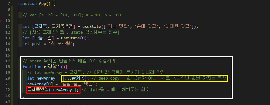 따라서 [...state]으로 복사해서 newArray 변수에 넣어줄 건데, 이 deep copy는 값 공유가 아닌 독립적 값을 갖는 복사입니다. [...글제목]으로, 글제목 배열을 복사해 newArray 변수에 넣어주시고, 이 변수의 배열 첫 번째를 기존 '강남 맛집'에서 '강남 숨은 맛집'으로 바꿔줄 것이기 때문에 newArray[0] = '강남 숨은 맛집';으로 변경해줍니다.