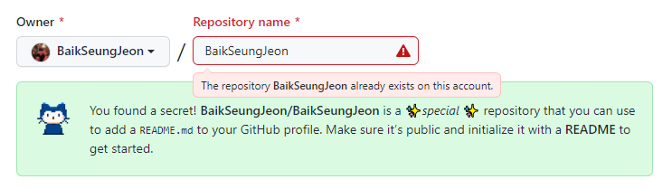 사실 이게 끝입니다. 왜냐하면 나머진 꾸미기의 영역이기 때문입니다. 아무튼 다시 본론으로 돌아와 본인의 깃허브 아이디와 동일한 이름의 리포지토리를 생성해 줍니다.