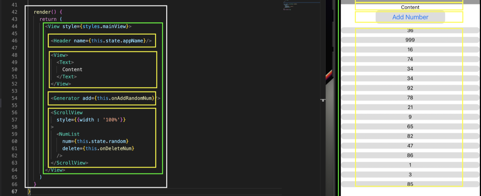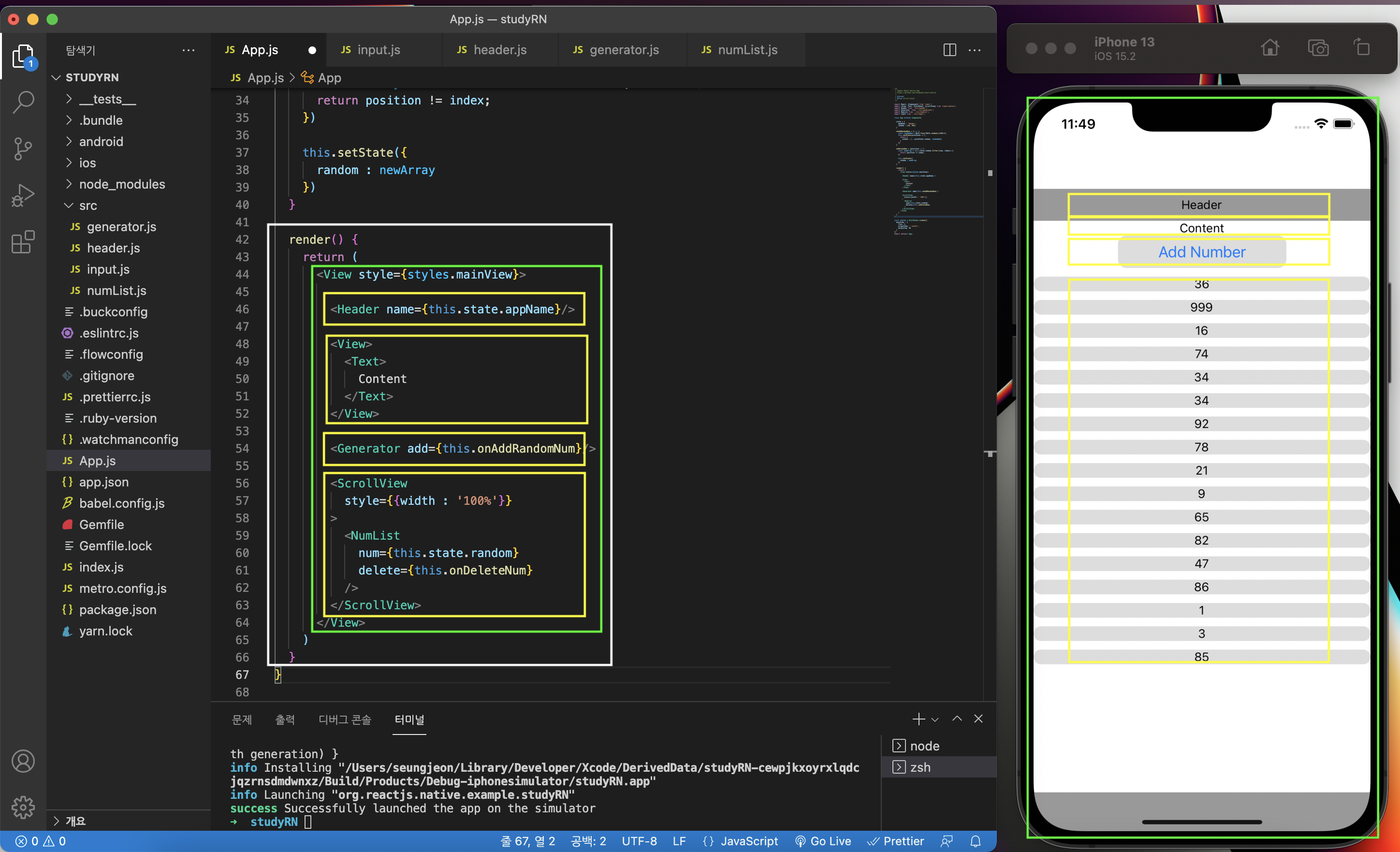 이미지의 개발 내용은 Add Number 버튼을 클릭할 시 임의의 숫자가 계속 쌓이게끔 한 것인데요. 계속해서 쌓일 시, 스크롤이 필요하기 때문에 이런 경우에 ScrollView를 사용하시면 될 것 같습니다. 다음 글에서는 style 지정하는 방법과, 지금 미쳐 못 다룬 기본 컴포넌트에 대한 일지를 작성할 계획이고요. 이후에도 네비게이션이나 애니메이션, 실제 모바일 UI 개발 등, 진도를 계속 빼 일정 주기마다 공부 일지를 작성할 계획입니다.