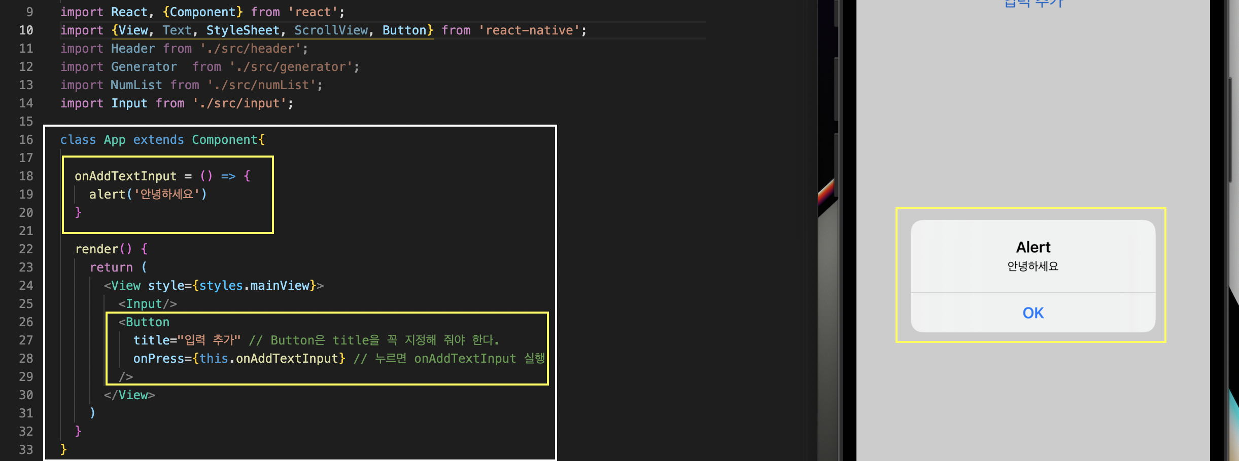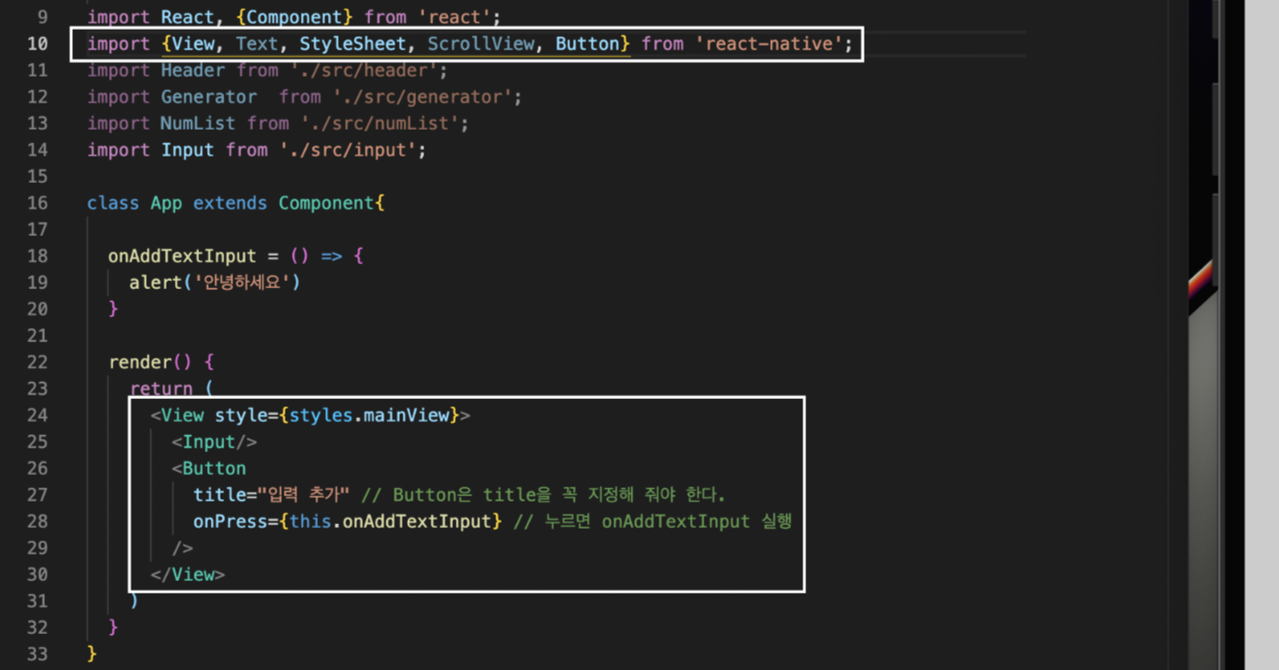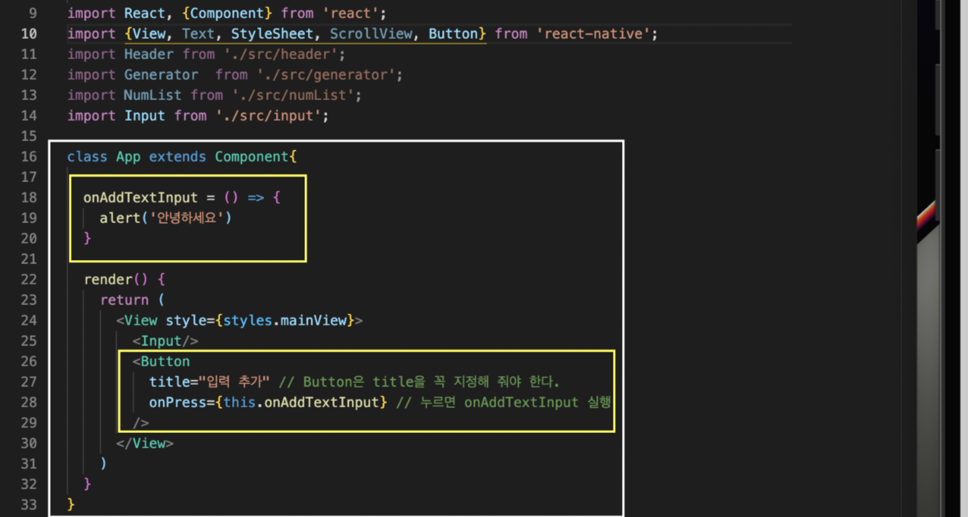 노란색 테두리를 보시면, 버튼을 만들기 위해 리액트 네이티브 모듈로부터 Button 컴포넌트를 import 해 오면 됩니다. 해당 코드는 onPress를 통해 버튼을 누르게 되면 onAddTextInput 함수가 실행되도록 해 준 결과물입니다. 주석을 보시면 아시겠지만, Button 컴포넌트는 꼭 title이 지정되어야 합니다.