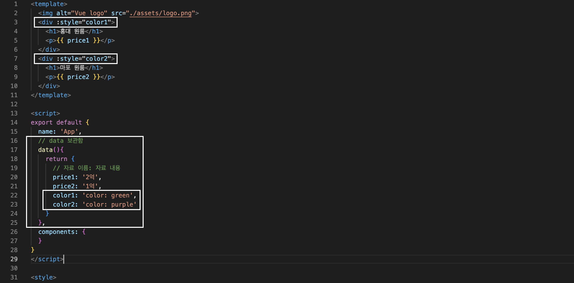 가격처럼 바뀔 수 있는 데이터들을 데이터 보관함에서 데이터 바인딩 해서 가지고 와야 실시간 렌더링으로 더욱 유연한 페이지를 개발 할 수 있습니다. 그리고 데이터 바인딩 할 때 꼭 텍스트뿐만 아니라 스타일 지정도 가능한데요.