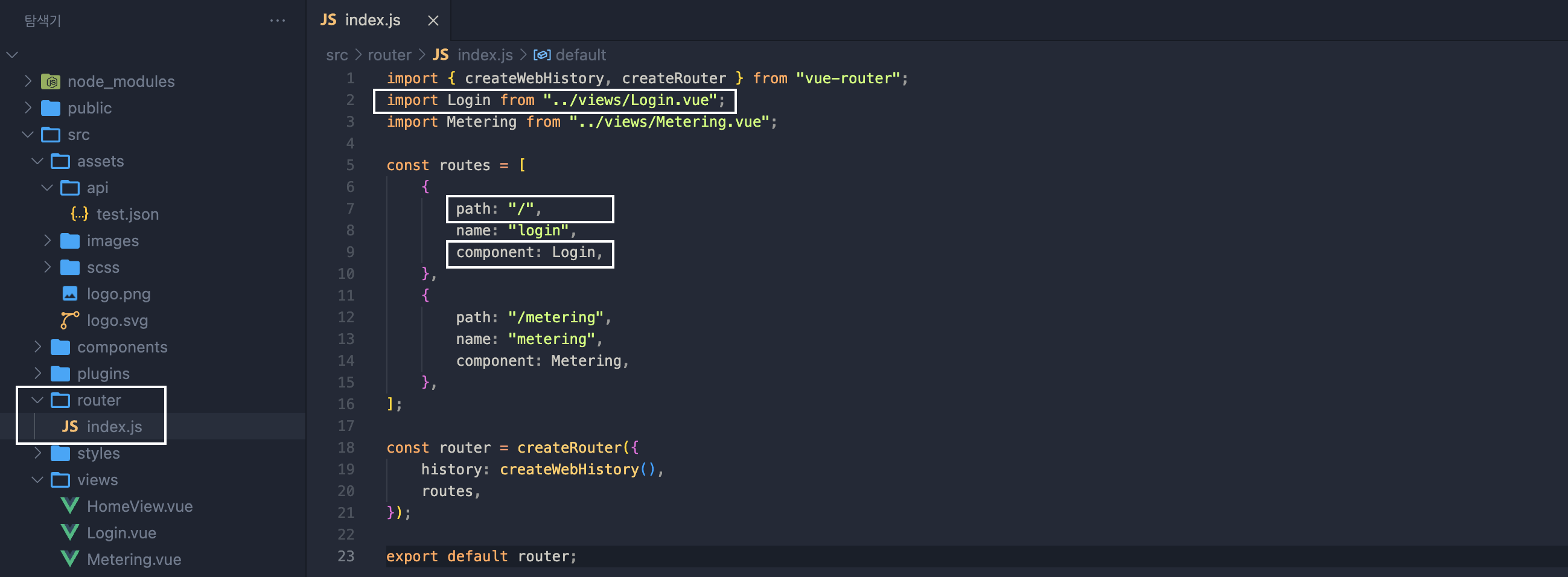 컴포넌트 import 후 path와 함께 등록해 줍니다. path는 "/" 뒤에 적절한 텍스트를 입력해 경로를 지정해 줍니다.